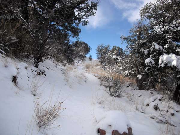 One of the down sides to hiking in the snow is there isn't any place to sit down and rest. There isn't even any place to put down your pack while you rummage through it looking for water. The up side is that you don't need much water, and a mouth full of snow will hold you for quite a while. Hiking that trail in the summer, that same mouth full of snow would be a highly prized commodity. |