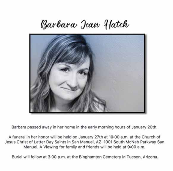Barbara Jean Hatch passed away on Monday, January 20th 2020 at the age of 60 at her home in Oracle, Arizona. Barbara was born August 17th 1959 in Yakima, Washington the youngest of four girls, so AJ-you can relate, "the baby of the family." Barb was born to Paul Steven Jones and Peggy Jean Jones. Barbara was given her mother's middle name. Barb officially became one of the Jones boys of Harrah. Harrah is a very small town where everyone knows everyone. Barb attended Harrah Elementary school where her mother was the secretary and White Swan High School where her father was the bus driver. They knew about Barbara's shenanigans before she even got home.