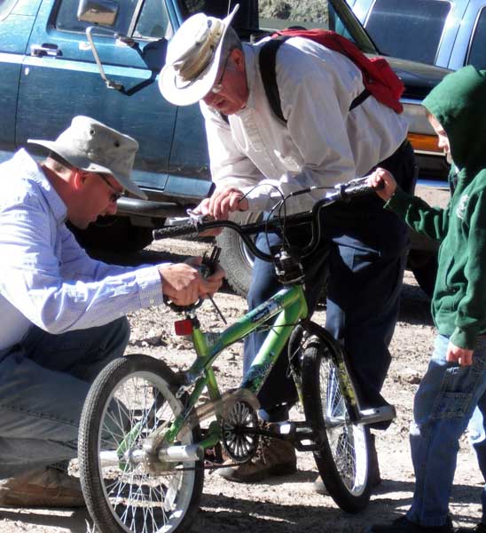 We sandwiched the riders between two vehicles--Barbara driving the Bronco and pulling the bike trailer in the rear, and Ameilia driving her truck in the "point" position. Barbara wanted to ride a bike, but by offering her concessions (to be named later [How else could you get a smile like that?]) She acquiesced.... |