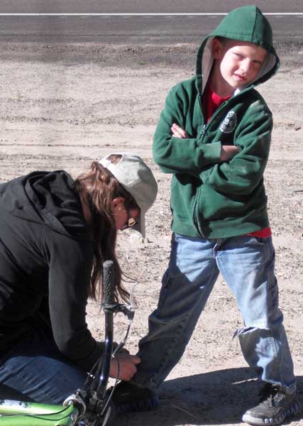 This location (between Alpine and Eagar) was a pretty good choice. There was more traffic than I anticipated, but the shoulder was fairly wide and the grades were fairly steep. Kylie rode only a mile or so before it became evident that she was headed toward a case of road rash, so we induced her to continue riding.....inside a vehicle. Maybe next year Kylie... |