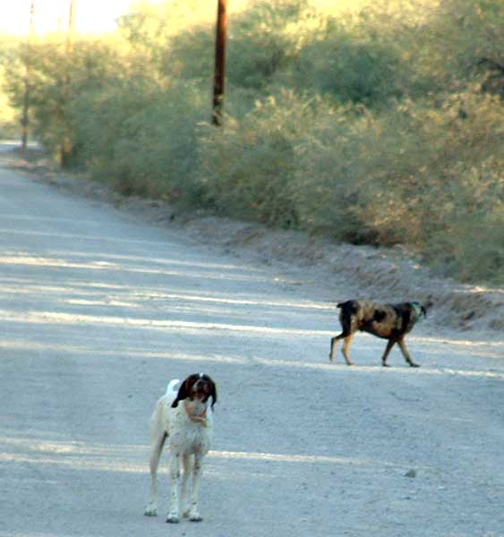| I also encountered three, rather territorial, canines (the third one is not shown). Barking dogs usually play a bluffing game, but if you run, they are very happy to chase you. I dismounted to confront them, and then pushed the bike the 300 yards or so it took me to pass the gate they were protecting before I was able to continued on my way. While I did not have to resort to even the threat of violence; it was reassuring to know that my CCW permit was functional. (If you look closely, you can just make out the washboards on the road surface.) |