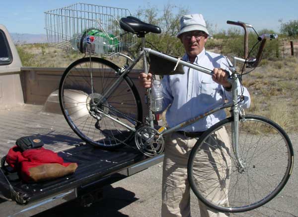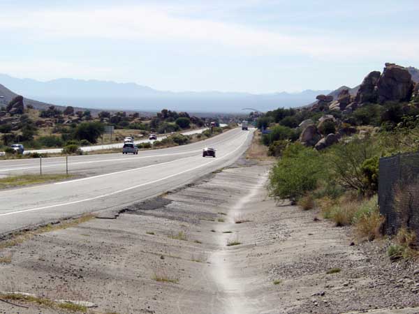 | My plan was to meet AJ in Benson (where I would leave my vehicle), accompany him and Jim to find the mine, and then bicycle from Willcox to Benson. When it came time to implement the last part of that plan, I found I had developed some strong misgivings about riding on the freeway. I had checked out the legality, but the thought of that many cars, truck, campers, boats, drunks, etc. going that fast that close was un-nerving. As it turned out, there was actually much more room than on a regular highway and I didn't even feel the wind from the big rigs, but I just about canceled the ride before starting. |