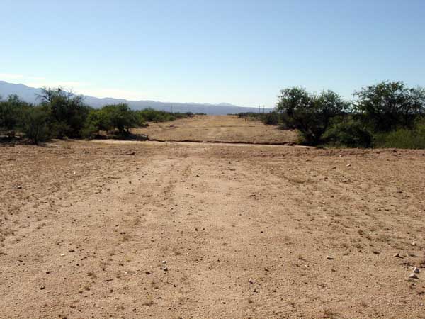 | It's illegal to walk along the freeway (the entrance actually had a posted sign so stating), and a passing Highway Patrolman would have limited his services to calling a tow truck (somehow I just couldn't see paying $100 plus to have my bicycle "towed" to Benson). My plan was to walk along Sybil road towards St. David until I crossed the railroad, and then follow it to Benson. After walking about ¼ mile, I came to a "petroleum" pipeline. It seems to me that pipelines run pretty much in a straight line, and this one seemed to be heading right where I wanted to go. |