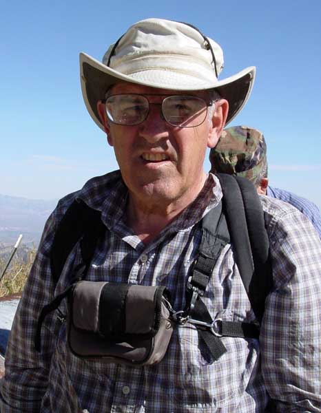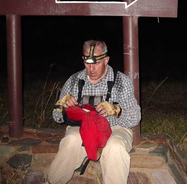 The Oracle Ridge Trail is composed mostly of trail, but also incorporates some road. We reached the road portion just as the last of twilight faded into darkness--and that was not a moment too soon. The road surface varied from usable, to ridiculous, with much of it being very steep. Dave forgot his hat, and Barbara lent him one. At one time, he was a Green Beret, and I still think he looks the part. |