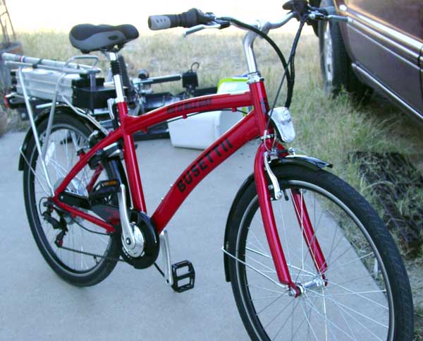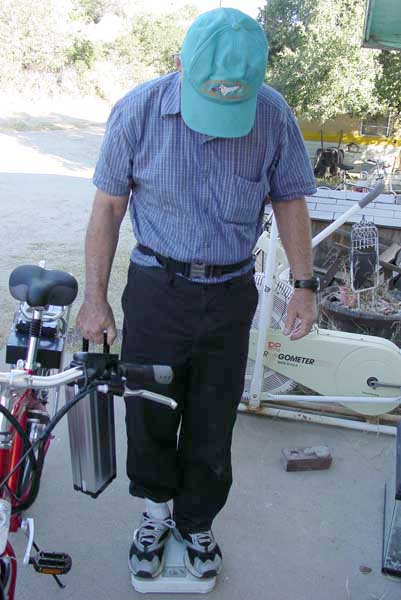 The bicycle Dave acquired is really a lot of fun. It has the latest and greatest in electromotive technology, and the fully charged battery is reported to be able to assist a rider travel about 50 miles on a single charge. Two batteries would give a range of 100 miles, and that's not too bad for a fat, old man. It is exhilarating to be able to alleviate the huffing and puffing associated with slowly ascending a long, steep hill by simply turning the wrist. A person could easily become spoiled by a machine like that. In fact, the term, "addicted" comes to mind... The fragmentary literature and abbreviated website devoted to this machine suggested that Dave's bicycle was supposed to have a weight of 52 lbs. Our scale suggested it was closer to 60, but then bathroom scales are notorious for being less than accurate. The extra battery came in at about 12 lbs. Carrying that much weight is almost equivalent to riding two bicycles... |