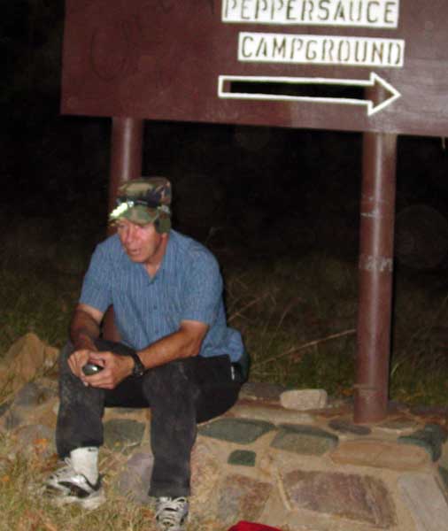 We both had headlights, but mine was not adequate for identifying and dodging rocks while traveling at any reasonable speed. The bike always seemed to be verging on loss of control. Frequently I would miss a large rock with my front tire, only to impact it with my rear. This often moved the back of the bike sideways 4 to 6 inches, and necessitated heroic measures to stay upright. We rode what we could of this section, but after 3 falls, my caution level rose to that of an old woman (I suspect Dave wasn't too happy with that, but he refrained from commenting). Further, I began experiencing cramps in the muscles of my upper left leg. Spasms are always temporary and their duration is short (when measured using a geological time scale), but at the time they seem like an approximation of eternity. I trudged along wishing I had brought the Ca/Mg/Zn pills, and KCl that I keep in my red backpack... Then I realized I had it on my back and was using it to carry water. After that epiphany, cramps were less of a problem. |