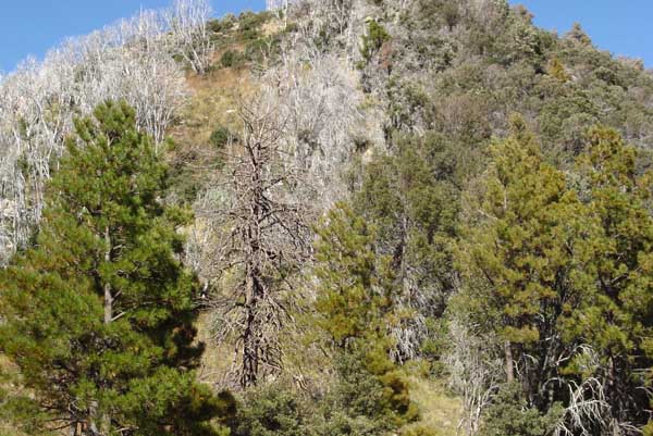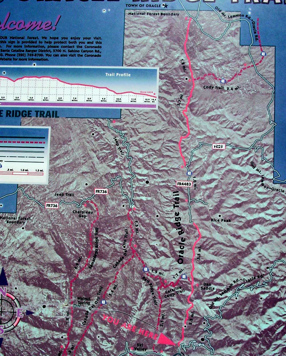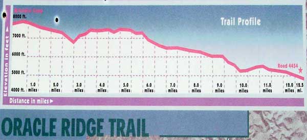 | We made it to Dan Saddle at about 3:30 p.m. and, although the map does not show it, there is an old mining road that leads down from there to the Mt. Lemon Highway. I considered taking that, but because we lacked a map, (I neglected to hunt one down in our haste to leave) and I could not find (on my camera) the photos Barbara took of the information posted at the trailhead, we continued on. On this profile, Dan Saddle lies in the valley at the 2.5 miles mark. To this point, the trail has descended about 1100 feet. It then proceeds to climb back up 600 or 700 feet. |