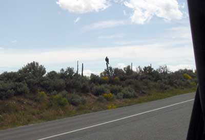 Just north of Monticello, Utah I noted a golden eagle sitting on a fence post only a few yards from the highway. There were numerous heavy trucks passing that point at full speed (with their accompanying noise and wind) but the bird just ignored them. I thought this a bit strange, and that I turned around and drove by it a couple of times, each pass at a slower speed than the previous one. My camera has a short lag time between pushing the button and firing the shutter, making it surprisingly difficult to get a reasonable photo of an object on the road side while traveling even as slowly as 45 mph. The slower I went, the more agitated the bird became, and on my 5th pass the eagle finally launched itself. |