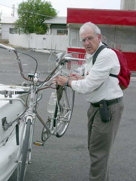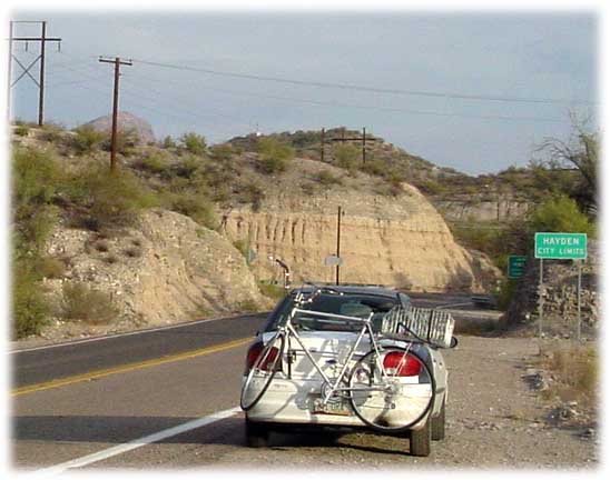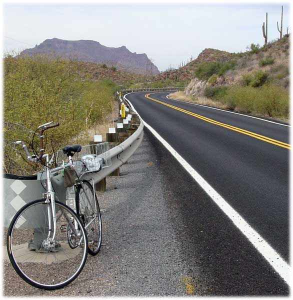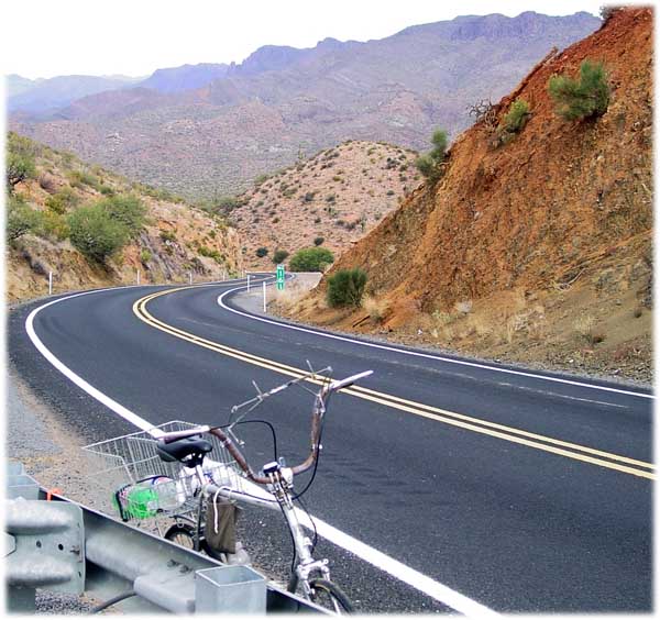 Highway 177 running between Superior and Winkleman has three stretches identified as 10% grades (the steepest I have seen in Arizona), and I have long thought that it would be fun to try them on a bicycle. On Vetrans Day, I did so. With the total distance being fairly short (31.6 miles) it was supposed to be an easy ride, but (as usual) it didn't turn out exactly that way. The first 10% grade is in the 6.8 miles between Superior and the pass, giving the entire leg an upward slant of 2.4%. The other two 10% grades are in the next 8.8 miles, ending near the entrence to Asarco's open pit. This leg has a downward tilt of 3.9%. From there, the route parallels the Gila River for 15.9 miles (upstream, over ups and downs created by drainage) and has a total upward grade of 0.24%. |