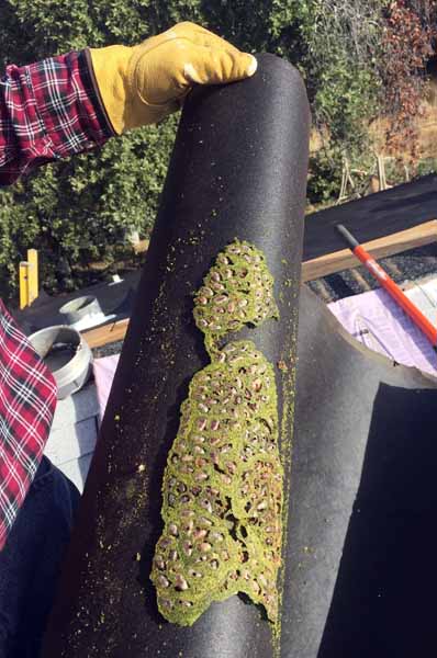 We ended up needing just a few more feet of roofing felt (aka tar paper). Fortunately I had a partial roll in the shed that was perfectly good, except for a small insect infestation...