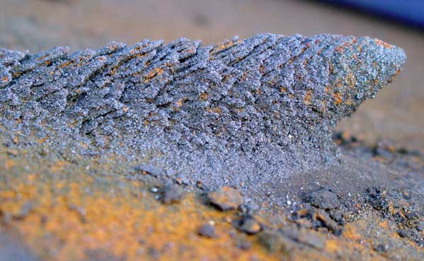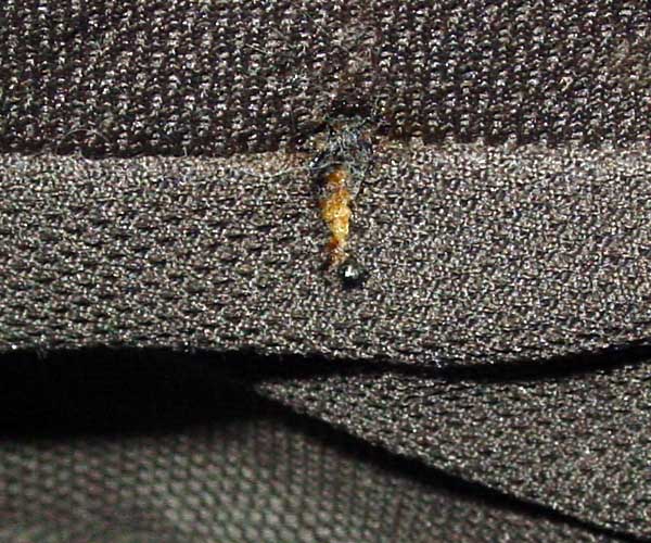 | Welding is pretty much a stoic sport, but occasionally it shares elements with dancing (if you include break-dancing as part of the genre). I ruined a lot of socks before I finally stopped wearing sandals to weld, but sometimes even high top foot wear isn't adequate. This is a close-up of the padding on the inside of the cuff of my boot. When this piece of molten slag dropped in there, I danced with the best of them. |