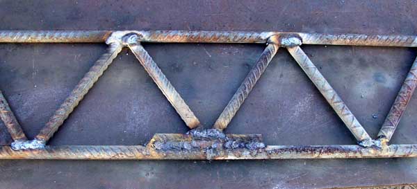 | There were around 500 cross braces, each welded on the front and back of the top and bottom. This is a lot of metal to melt, and the process went significantly slower than I anticipated. It also required more welding rod than I thought it would. I normally use 3/32" rod, but 5/8" rebar is larger than the materials in my typical projects. I found that better welds were obtainable using larger (1/8") rod. If my memory serves, I burnt up over 30lbs of this stuff and it sells for something close to $2 per lb., making prime lumber look better all the time. |