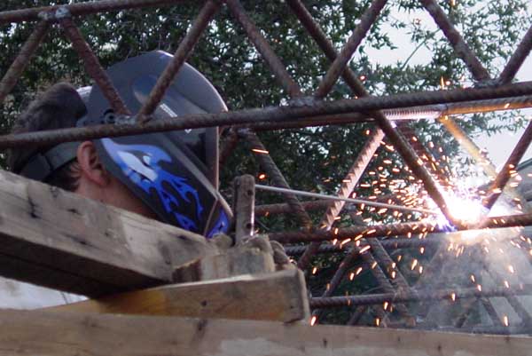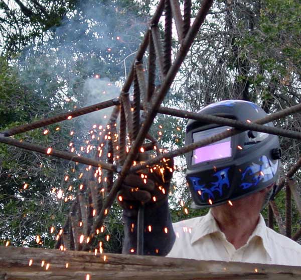 I encountered (via Craigslist) a gentleman in Wilcox who was selling #5 rebar (5/8 " diameter) for 20 ¢/lb. The weight of this rebar is very close to 1 lb/foot, making the calculations relatively simple. I purchased about 800 feet, and the curtain lifted on a production that has monopolized my free time since that fateful decision (circa May of 2010). |