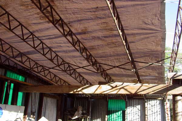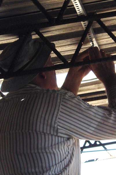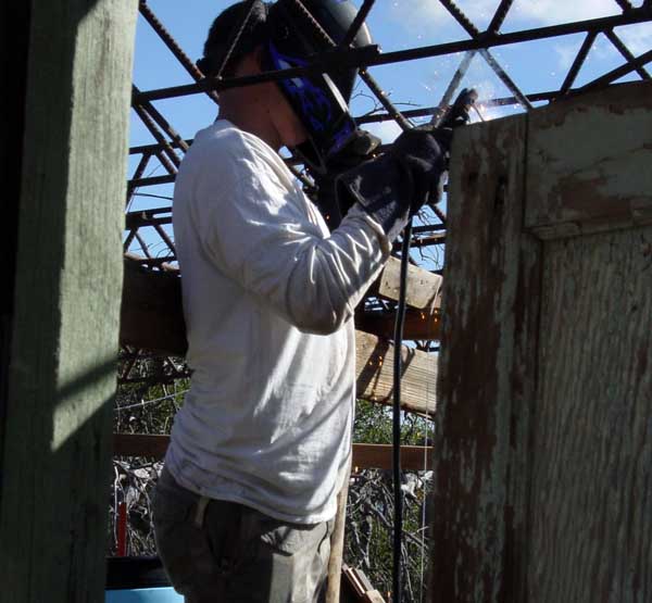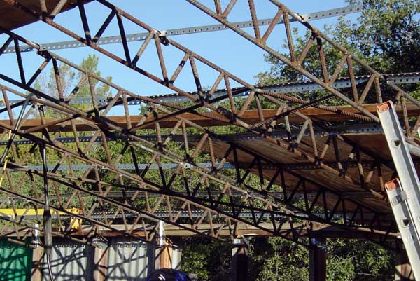 ...and yet more welding where each piece crossed each joist. I had some concern that this "holy" angle iron was too light to support the load of the roof. It was galvanized, and difficult to weld but after the roof was in place, it seemed to work well enough. |