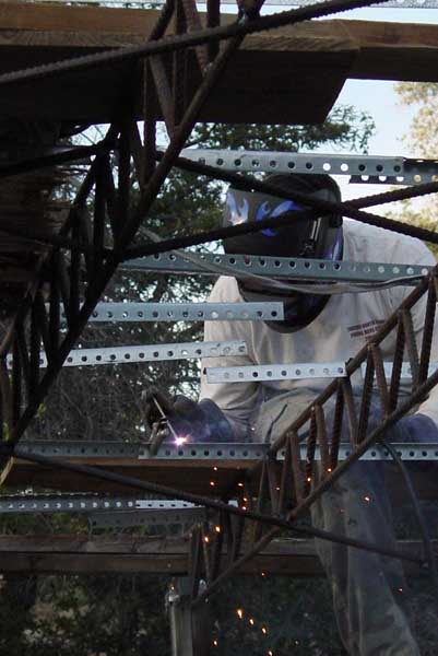 | ...and more welding. The new welding helmet has some idiosyncrasies. Apparently there is sensing panel on its' face, and if something comes between that panel and the arc (as in being behind a joist and welding on the next joist over), the view plate does not darken, and the user gets a bright surprise. |