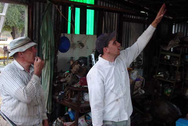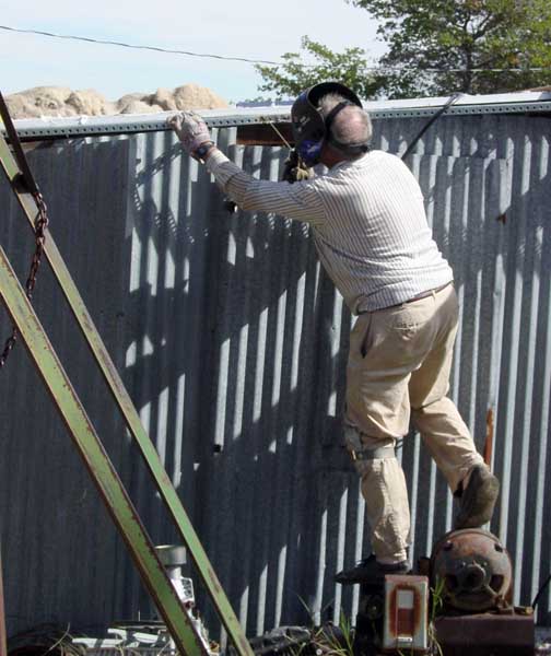 Much to AJ's chagrin, we didn't remove every thing from the shed, but opted to work over it. As a result we had several small fires, started by molten metal spray from the welding process. I was too busy extinguishing them to obtain digital documentation. |