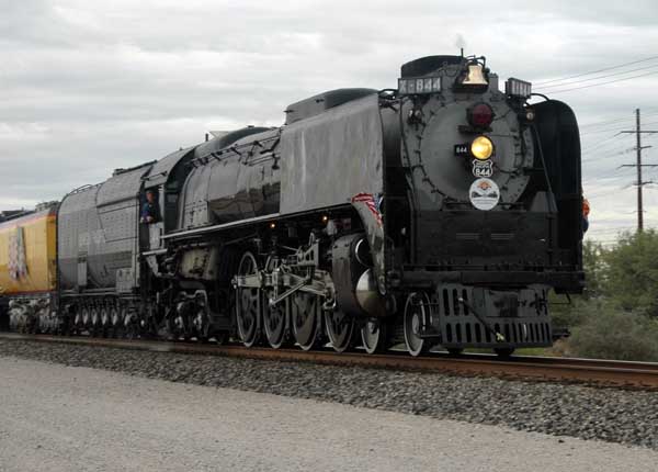 The Union Pacific Railroad maintains an antique steam locomotive (the last one they purchased before switching to diesel powered electric engines) and on special occasions, trundle it out for display. I'm not exactly sure what they are commemorating, but the engine, with about a dozen cars, is making a loop from its home in Wyoming through Colorado, New Mexico, Arizona, California, Nevada, and Utah. One problem with still cameras is they don't imply motion. In this image the beast is thundering along at about 65 mph. |