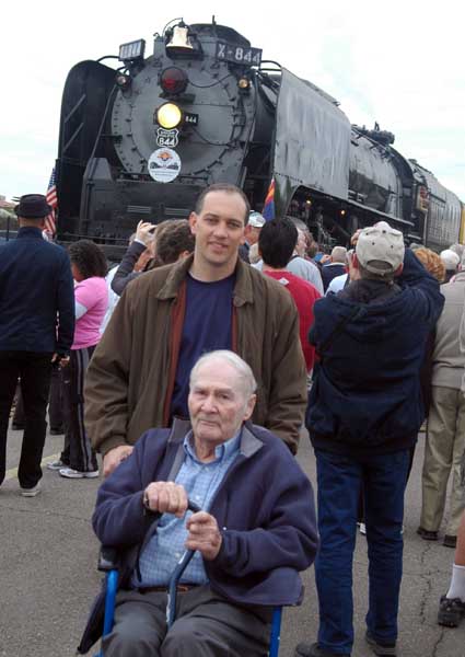 Nathen also brought Jim (who back in '37) actually rode a steam powered passenger train from Texas to California. We stood on the Campbell Avenue over-pass, and as the engine rolled under it, the engineer treated us to a blast from his steam whistle. That sound could be heard all over town, and at a distance of less than 50 feet, it made my ears ring. Jim, who had his hearing aid turned off, claimed he could feel it but not hear it... |