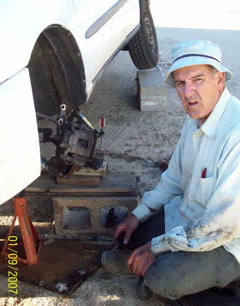 | The brakes on my Geo started making a metal on metal grinding sound. I ignored it as long as I dared, but finally tore into it. The pad themselves still had about a millimeter left, but there was a place where the brake backing was rubbing on the rotor. The whole brake replacement took only 25 minutes, and if the story ended here, it would be a happy tale indeed. |