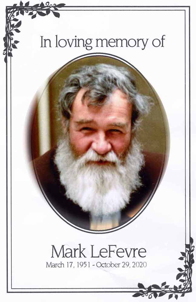 | My brother, Mark R LeFevre, passed away in the morning hours of Thursday October 29th 2020. His passing was both expected and unexpected. Expected, because he has been grappling with multiple myeloma for more than 10 years, enduring such medical remedies as chemotherapy, stem cell transplants, and new drug trials. Unexpected because he seemed to be improving. He, and his siblings, were anticipating a visit planned for the day of his demise. Life is certainly uncertain. Below is his funeral program, or more exactly the program for his graveside service. Large indoor gatherings are still frowned on in this part of the country. |