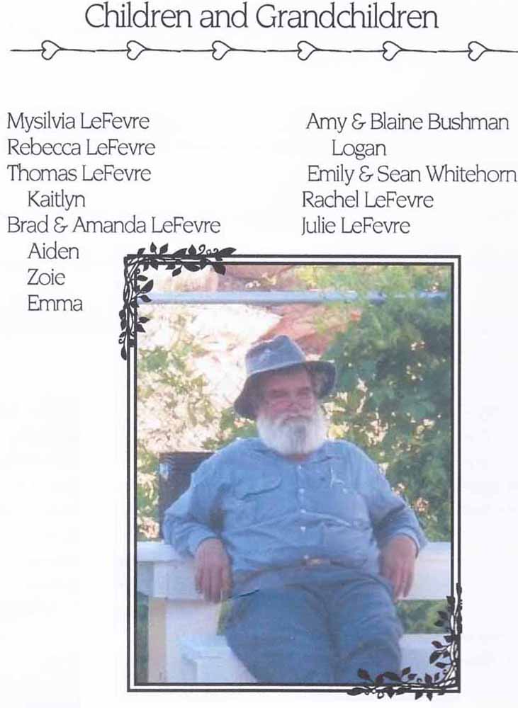 | Mark is survived by his wife Susan LeFevre; children Mysilvia, Rebecca, Thomas, Brad (Amanda), Amy (Blaine) Bushman, Emily (Sean) Whitehorn, and Rachel & Julie; siblings Alan Hatch, Karen LeFevre Laura (Fred) Zumwalt; grandchildren Aiden, Kaitlyn, Zoie, & Emma. He is preceded in death by his parents Reginald & Norma LeFevre; brother-in-law, Jim Smith, sisters-in-law, Barbara Hatch & Diane Hatch; & daughter-in-law, April LeFevre. |