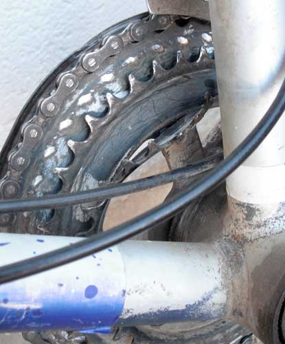 The next casualty was my old Mt. bike--you remember, the faded blue/white/turquoise/rust colored one? Attached to the crank are three chain rings. The smallest of these somehow snagged the chain as it was coming off, and managed to get bent--even to the point of interfering with the crank turning. The walk back to work was only a couple of hundred yards this time... For awhile, I thought the bike was dead, but then I located two other old bike frames in my yard that had the same type of cranking system. While the parts were interchangeable, they were not identical. I went from a large chain ring having 52 teeth to one having only 50, so my top end speed will be lower. On the other end, I went from one having 36 teeth to one having 30, which means hill climbing should be easier. There are always compromises in this sort of a deal. In spite of all my mechanical problems, I have been able to do a little riding. For starters, I left my car in San Manuel (by transporting the motorized bike there and then riding it back to Oracle), and rode the suspension bike to San Manuel via the trails that start on Mt. Lemon Highway opposite the turnoff to Campo Bonito. The suspension bike is heavy and seem reluctant to roll, but once I reached the washed out roads and trails leading across the desert to San Manuel, it performed admirably. The ride was a bit challenging, but very enjoyable. I have too many bikes, and I was thinking that maybe I should get rid of the suspension bike. Unfortunately, this ride cured me of that thought. |