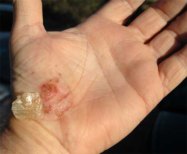 The fates are not always kind. Last Tuesday, I fell off my bicycle. For me, that is a relatively rare event, with the last occurance transpiring more than 14 years ago (although I remember it as being a lot nearer in time than that). I was riding at "lunch time" and rolled through the stop sign at the intersection of McNab and Highway 76 (Reddington Road), went across the intersection and into the entrance to the plant site, with the intension of circling around the small traffic island there and coming out onto Highway 76, headed towards Oracle. Apparently the grade was steeper (such that I gained more speed) than I anticipated or the curve sharper (or both), because I failed to make the turn, jumped the curb, and measured my length on the ground (after a logintudinal roll). It was a relatively low speed event and I was amazed by the damages. I incurred lacerations on both palms (see the photos below, taken after four days of antibodic ointment treatment [the camera was "visiting" Karren]), my right knee, my left fore and upper arm, and my left shoulder. After two relatively sleepless nights, I visited Dr. Brower who, (after ordering at least a dozen x-rays) concluded that I had broken a rib (although the location of the "break" he identified in the photos has absolutely no pain associated with it). Still, other consistent symptoms are present. It hurts to take a deep breath, arising from lying on my left side is both slow and painful, I can't cough without initiating acute distress, and sneezing results in a debilating paroxysm that subsides in about three minutes. Lifting and/or moving my left arm is occationally problematic, and there are areas on my rib cage that are tender to the touch.