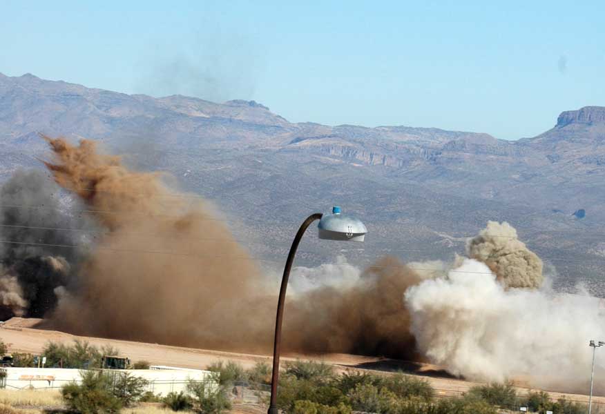 There was actually a new film crew down on the tailing ponds who also had a great view. Their video footage is viewable at www.azstarnet.com. They have changed the footage since it was first posted (turned it into a news report that is not as good as the original in my opinion) and probably will not have it available for more than a day or two. The 10 knot wind was blowing the wrong way, and the towering cloud of dust just missed the clinic, but drifted over the fast stop next door, as well as much of the town. Exciting, huh?