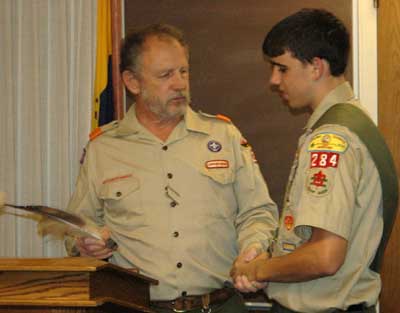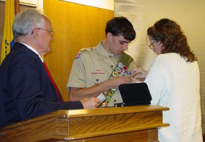 AJ's Eagle Court of Honor was held (finally) on February 24, 2006. It was a fairly well attended function, as these sorts of thing go. The dynamics of hosting a "non-required" function and getting people to attend has never been intuitively obvious to me, so I was somewhat surprised at the large turnout. Then again, seventeen family members were there and seven others were part of the program so maybe that isn't so surprising after all.