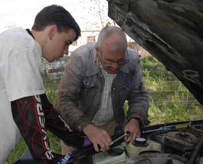 At last it was finished. All things considered, it was fairly easy. We had to remove the tire, the mud flap, the reservoirs (coolant and windshield washer), the serpentine belt, and 9 bolts. We arrived at 0835, and had the job finished and road tested by 11:05 (including a trip to the autoparts store to replace the piece we broke).