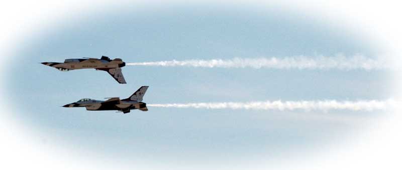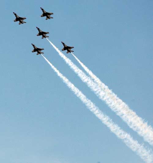 | Since the show is sponsored by the Air Force and they set the schedule, they chose for the finale, the Thunderbirds. The Navy has the Blue Angels, whose routines are very similar to those of the Thunderbirds. The Army has the Army Sky Knights, whose precision flying is done in helicopters. I have only heard of them briefly and never seen them. The Marine Corp is connected to the Navy, and at least one of the Blue Angels is a Marine Corp Officer. |