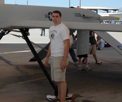 | The Air Force kid (they all look like kids to me) stationed by this Predator (an unmanned drone) claimed that it is the same model currently being used in our relatively successful missile attacks in Afghanistan and Pakistan. I thought the Air Force had upgraded to jet powered models, but I guess there is no reason a priori that the old prop jobs won't still work. If you live in a third world country, your AK-47 won't shoot that high, even if you could see them. |