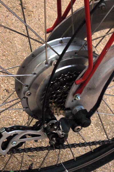 | As above noted, the battery weighs 14 pounds. The motor and accoutrements add another 11 pounds, for a total of 25. That makes the bike difficult to ride uphill when the battery has died. The batteries are lithium ion, and the first 5 times they need to be run entirely down before being re-charged. To accomplish this, I have mounted both on the bike (39 pounds worth) and when one dies, I plug in the other, and head for home. The batteries, electrical gear, plus the 35 pounds of the bike itself make for one heavy machine when you have to pedal it unaided. When fully operational, each battery should be good for a 50 mile trip (level ground, 15 mph, no wind, 160 pound rider). I can hardly wait to see if it works out that way... |