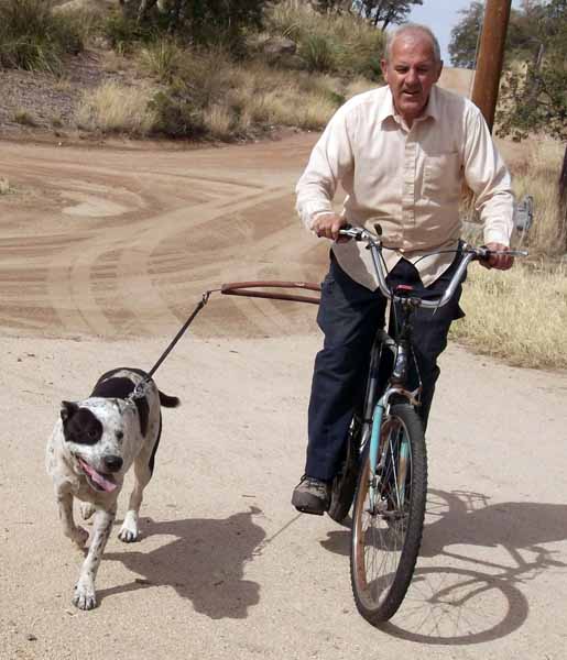 | My dog needs more exercise than he is currently getting. In an effort to correct this, I designed and fabricated a device to attach him to a bicycle, such that I could ride (while he walked/loped/ran beside me) and at the same time keep him away from cars, people, other dogs, etc. |