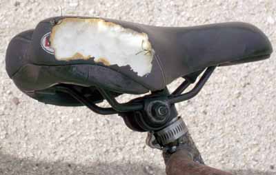 | Compton is now slightly more than a year old, but still displays numerous traits associated with puppyhood. I needed to make a slight adjustment to the "dog bike rack," and left him connected to the bike for perhaps 45 seconds while I did so. In that length of time, he chewed up a quarter of my bicycle seat. They say a dog becomes an adult at about three years. Sometimes I have my doubts as to whether Compton will survive to celebrate that milestone... |