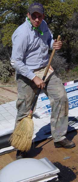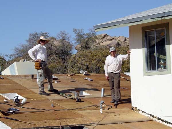 AJ and Barbara hauled two pickup loads to the dump (and paid a king's ransom* to leave it there), but there is still a mess in the back yard. Oh, well, that's why they make tomorrow... (*Barbara went to Mammoth Court House Complex and after producing a current electric bill received 3 vouchers good for 750 pounds for free per year. Aren't bureaucracies wonderful?) We also managed to track tar all over the carpets in the house. If that nasty stuff repels water half as well as it transfers between objects, we should be able to turn the house upside down and use it for a boat. |