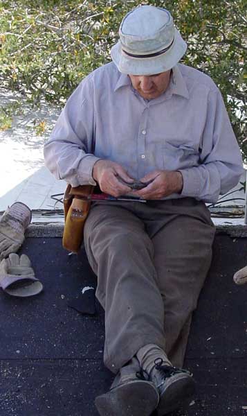 | Here AJ shows off the latest style in construction worker attire. Isn't it amazing the changes that can be wrought by a sunburned neck? | |