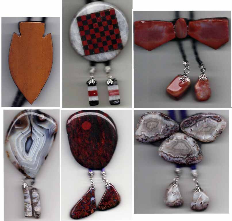 Because I wanted to make something from what we collected, I shaped a stylized arrowhead out of a piece of relatively nondescript yellow-brown jasper. And finishing one project stimulated me to finish several others that have been sitting around waiting for inspiration. What these six pieces have in common is that they were polished by adding something to their surface instead of removing microscopic surface roughness. In the case of the chessboard it was a two part floor wax that bills itself as leaving the surface "looking wet." The others were coated using an epoxy based product called "Super Glaze," a "pour on," "self leveling," liquid that cures in only 72 hours. I have the somewhat eccentric habit of naming the products of my compulsions. The arrowhead and the chessboard are obvious, but can you pick out the bat eared moth, the walking fish, the scream, and the bolo tie bowtie? (These images were captured using a scanner. Hence the shallow depth-of-field.) |