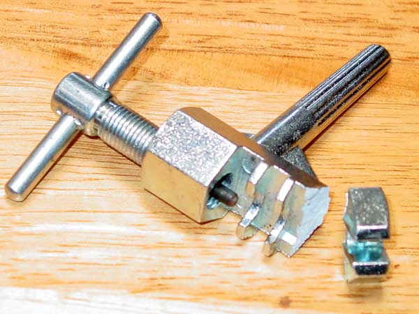 | I have been "servicing" the recumbent, and broke my chain tool, so I purchased a replacement. This is what happened the first time I use it. You just can't get good tools... When I first acquired the bike, I replaced the front chain ring (that had 48 teeth) with one that had 52 teeth. It hasn't shifted well, so I added four more links to the chain. That made the chain jump (in the high range) so I removed two links. Hopefully that will correct the problem. |