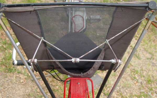 | By moving the kick stand as far to the rear as possible, the bag is clear of the circle of foot rotation by about 4 inches. A second down side is that the bag swings laterally, and contacts the moving drive chain with some frequency. I solved that problem (I hope) by wrapping a piece of window screen around the bag to absorb the abrasion. This screen will eventually wear out, but I look at it as "disposable." |