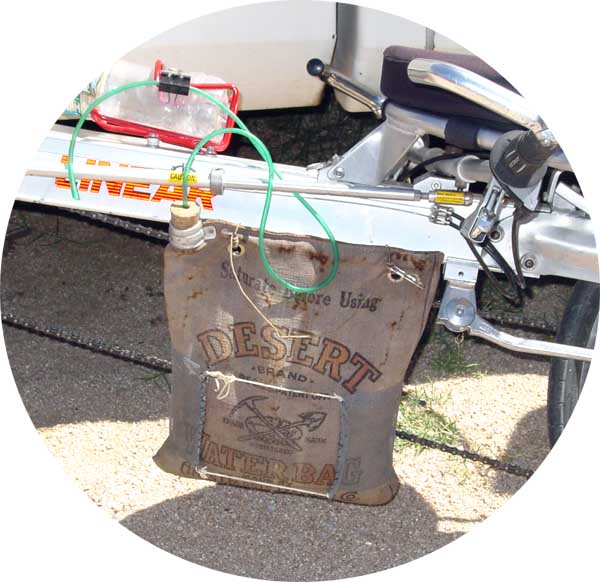 | Although not obvious at the time, it also broke the fiberglass rod that keeps the seat posts separated. After redesigning and replacing the seat post spreader, I modified the bag holder design, and manufactured rack 2.1.2 out of gas welding rod which is much more ductile. While I was patting myself of the back (I think this design is stronger and will work well), I realized that if at some point in the future I am going to ride cross country carrying anything other than a small notebook and a large toothbrush, I will have to use the rack behind the seat, and the water bag (which slowly drips) hangs almost directly over that area. Not good... |