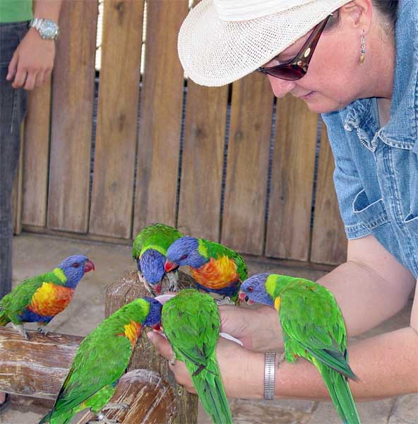 I addition to deer, donkeys, and ostriches, they had an enclosure housing lorikeets--a brightly colored bird with a curved beak similar to a parrot (but smaller). |
