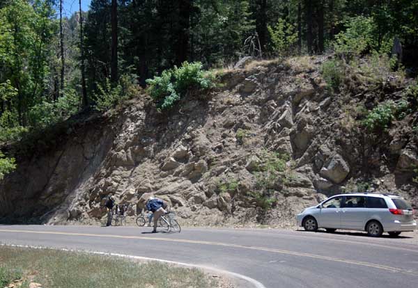 If I read the on-line topographical map of Mt. Graham correctly (and my estimation of where we camped is accurate), we started our ride at a elevation of 9,526 feet, and finished at 3,231 feet, for a net change of 6,295 feet. This photo op stop shortly after the start of the ride offers supports for that estimation. |