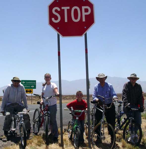 The next morning, We awoke to a flat tire (4 psi internal pressure) on Nathen's van. Vigorous application of the bicycle pump increased that pressure to 20 psi before Nathen took his turn, and broke the pump (a piece of the plastic housing in the bottom of the housing ruptured--how odd is that?). We decided the van would roll down the hill with that pressure--if we took it slowly, so Terre (as well as the drivers) stayed behind the bicycles (this also served as a screen for cars coming down the mountain behind the cyclist [both of them]). |