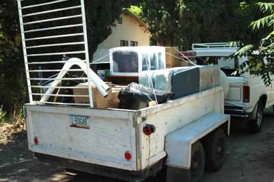| Perhaps one of the most significant, is the fact that Symantha moved to Tucson. After much soul searching (and perhaps grinding a few molars), she decided to give up the good life working for Walmart, and sample the vagaries of the big city. We (Nathen, AJ, myself, and a nephew of Terre's whose name escapes me at the moment) showed up on her doorstep (with a trailer borrowed from Jim), and two hours later we were on the road again... When I left home for school in 1964, my worldly possessions fit nicely into two suitcases. Four years later when I came home for the summer, my possessions filled my 1959 Rambler station wagon to just over the level of the seatbacks. Upon reflection, I think Symantha is acquiring "goodies" a rate about 8 times as fast as I did. I hope she doesn't end up with a house that looks like mine... |