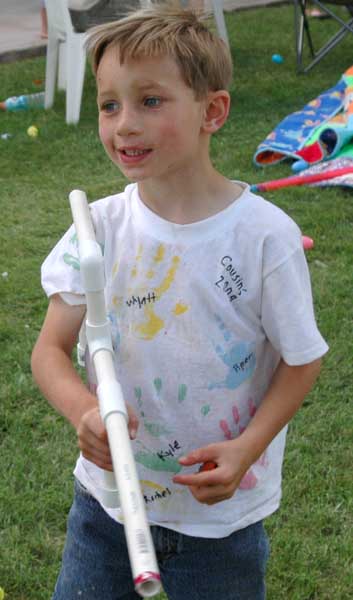 I think this marshmallow gun was Mark's contribution. It is not obvious to me why you need two right angle turns in the projectile pathway, but it seems to work. Perhaps it creates just enough resistance to allow the pressure to build. |