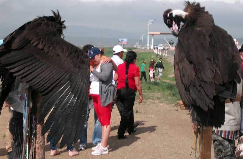 These are Eurasian Black Vultures and we saw many of them in the skies of Mongolia. They are one of the largest birds of prey in the world, with a wingspan of 8½ to 10 feet, and are only distantly related to new world vultures. These captive individuals were at a roadside stand where, for a small fee, you could have your photo taken with one standing on your fist and dwarfing you with its outstretched wings. These birds actually seemed to be enjoying themselves (or at least the food rewards that accompanied each photo session).