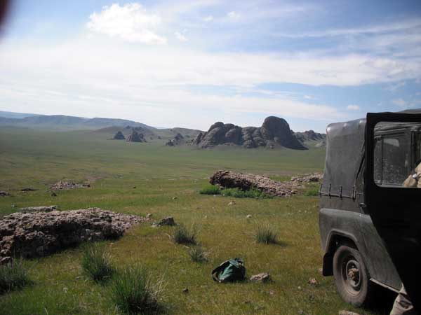 Sites such as this are relatively common in the countryside. They are either burial sites or monuments. Various internet sites called them Khirigsuurs. Our translator, a native Mongolian, called them Koorgons, and said the term meant, "ancient ones". I had trouble understanding even single Mongolian words. We would arrive at a town and I would inquire as to its name. Our translator would clear his throat and cough, and that would be the name. I would do the same and make the same sounds, and he would laugh at me. Given that scenario, it is possible that the two names above are, in fact, the same. Our translator works as a tour guide and, perhaps because of that, felt that he should have the answer to all our questions. Sometimes he would pontificate at length about some subject, when I was pretty sure the correct answer was, "I don't know".