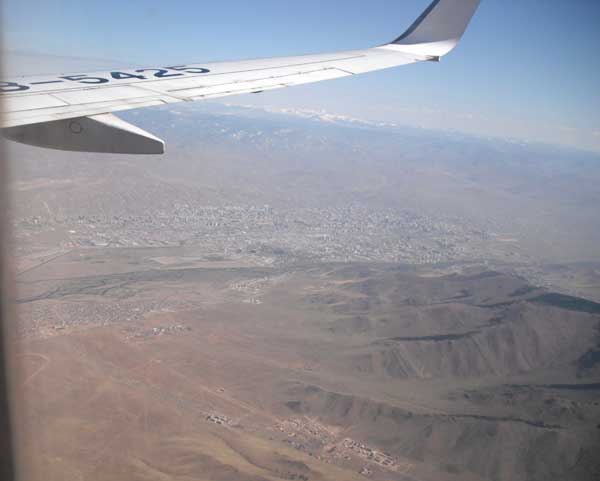 There were many surprises on the trip, the first being the route our aircraft took. I expected to leave Los Angeles International Airport and immediately be over the ocean (given that it's runway ends about 2,000 feet from the shore). I had a window seat on the right side of the plane, and for the first half of the trip we stayed either in sight of land, or over it. Our route took us up the West Coast of the United States. I saw the Golden Gate Bridge in San Francisco, followed by the cities of Portland, Seattle, and Anchorage. This route is called a "Great Circle". On flat maps of the world, the route doesn't make sense, but laid over a globe, one can see that it is, in fact, significantly shorter. This image (lifted off the web) only approximates our route. After leaving Alaska, we passed over the Bearing Straights, parts of Russia (Siberia), and finally descended into Beijing, China. From there we took a connecting flight to the famous Ghinggis Khaan International Airport in Ulaanbaatar, Mongolia. |