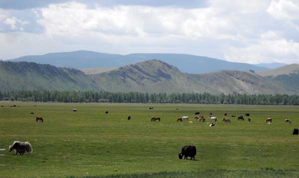 Much livestock is raised in Mongolia. Sheep and goats are ubiquitous. In addition, cows, yaks (seen in the foreground of this image), and horses are all raised for food. (Yes Ameilia, the Mongolians really do eat horses [taste just like chicken].)